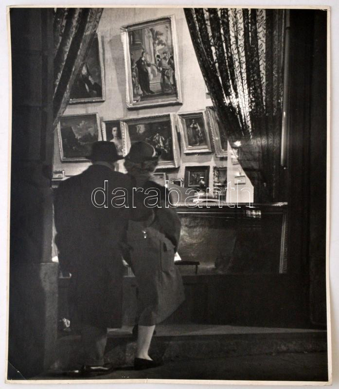 Leírás: 1956 Sztály János (1899-1980): Kirakat előtt, jelzés nélküli vintage fotóművészeti alkotás, sarkán törésnyommal, 40x30 cm