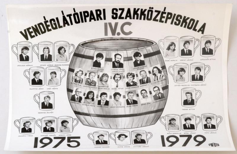 Leírás: 1979 Vendéglátóipari Szakközépiskola tanárai és végzős diákjai, kistabló 38 nevesített portréval, 24x30 cm