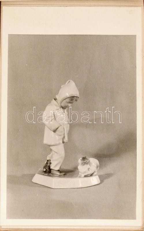 Leírás: É.M. Pécsi Porcelángyár, porcelán díszműtárgyak. Fotóalbum gépelt leírásokkal, 37 képpel, 14x9 cm