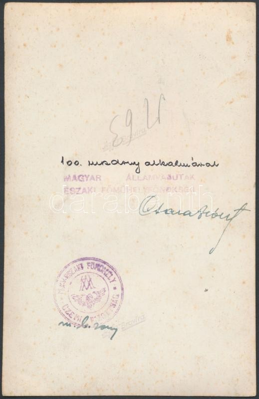 Leírás: Férfi portré, "100. mozdony alkalmából" felirattal, Magyar Államvasutak Észak Főműhelyőnökség pecséttel, 17x11cm