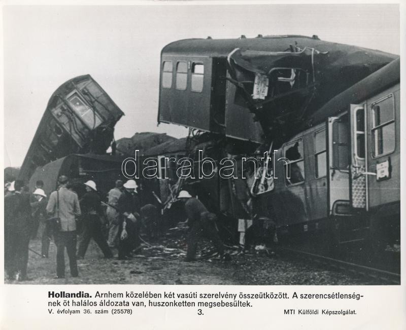 Leírás: Vonatszerencsétlenség Arnhem (Hollandia) közelében, MTI-fotó, feliratozva, 20,5×25 cm
