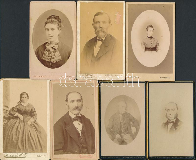Leírás: cca 1860-1900 Vegyes keményhátú kabinetfotók, 10db, ebből 7db verzón feliratozva, különböző budapesti ill., külföldi műtermekből, 10x6cm