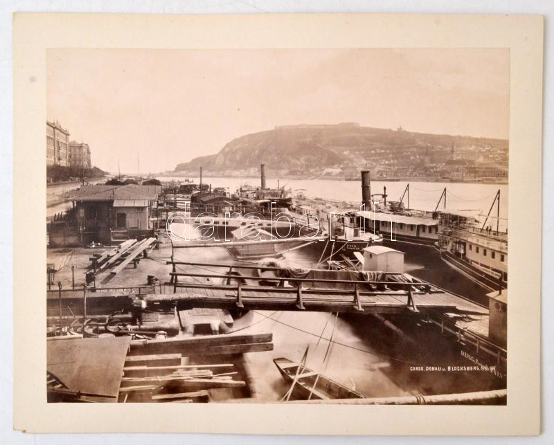 Leírás: cca 1900 Dunakorzó, dunai kikötő, háttérben a Gellért heggyel, Tabánnal. Nagyméretű fotó 29x23 cm