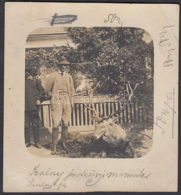 Leírás: cca 1918 Szalay László (1859-1941) miniszteri tanácsos, pénzügyminiszter vadásztrófeával, fotó, feliratozva, 6,5×6,5 cm