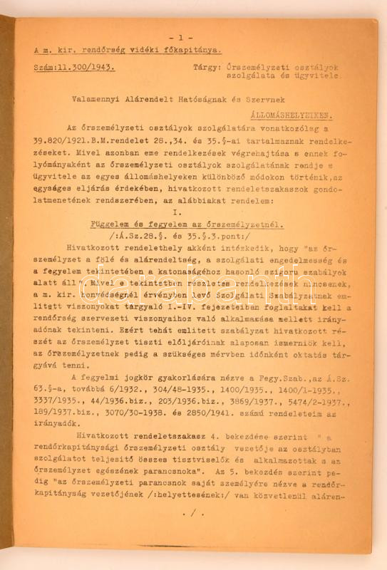 1943 A M. kir. rendőrség vidéki főkapitányának rendelete, őrszemélyzet... https://www.darabanth.com/hu/272-Gyorsarveres/272.0/Festmeny-mutargy-papirregiseg-egyeb/Militaria~20/1943-A-M-kir-rendorseg-videki-fokapitanyanak-rendelete-orszemelyzeti-osztalyok-szolgala~II1384460