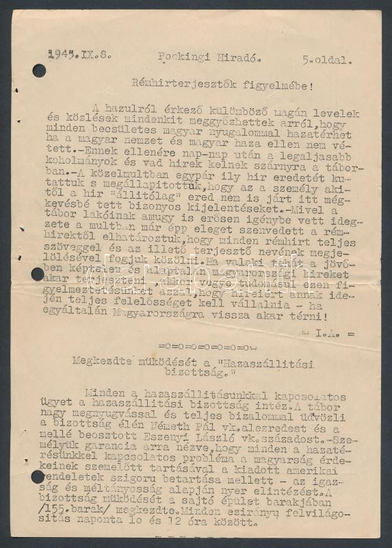2 db. Pockingi Híradó kiadvány. 1 db. 1945. IX. 8. kiadvány 5. oldala, amely tudatja, hogy megalakult a Hazaszállítási Bizottság. 1 db. 1945. IX. 14. ugyanolyan közlemény, amely Hazaszállítási Bizottság közleményét tudatja. Gépelt papírok, amelynek a másik oldalain eredeti német nyelvű szöveg olvasható. A Németországi Pocking hadifogolytábor hivatalos kiadványai, amelyek a tábor lakóit voltak hívatottak tudósítani az őket érintő hírekről, és információkról. Illetve ,,otthoni" hírekről.