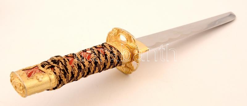 Dísz tantó, japán tőr, gazdagon díszített markolattal és hüvellyel, pengehossz: 22 cm, teljes hossz: 37,5 cm + fa tartóval /