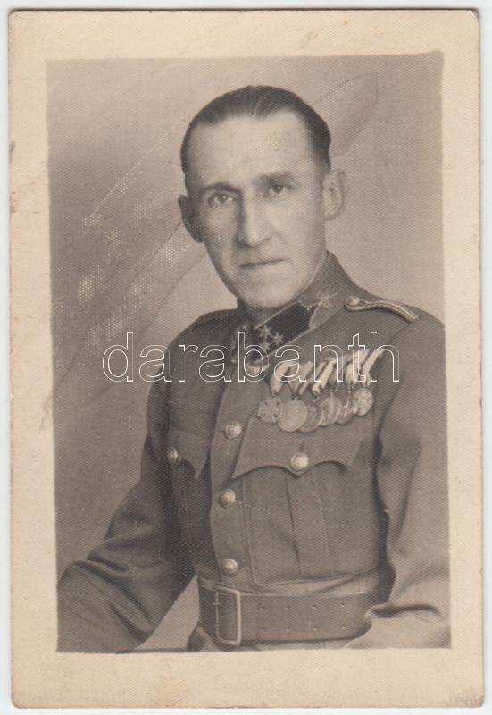 Leírás: Olcsvay Géza(1896-1971) százados kitüntetéseivel, Ludovika Akadémiai tanár és iparművész fotója, keményhátú fotó hátoldalon feliratozva, felületén folttal, 9x6 cm