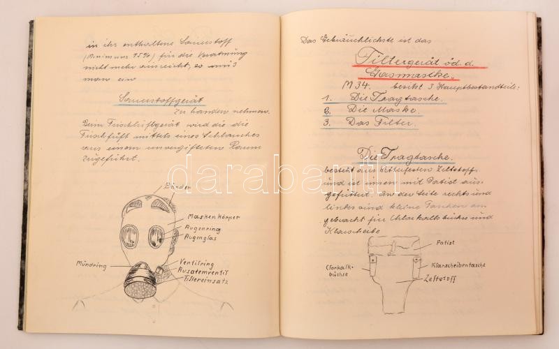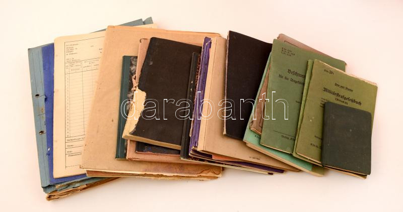 cca 1914-1945 Vegyes osztrák illetve német katonai anyag: katonai szabályzatok (6 db), kézzel írt technikai feljegyzések, leírások, számos műszaki és más rajzzal, stb., érdekes anyag, vegyes minőségben / cca 1914-1945 Austrian and German military material: published army manuals (6 pieces), handwritten technical notes and descriptions, with many technical and other kind of drawings, an interesting material, in mixed condition