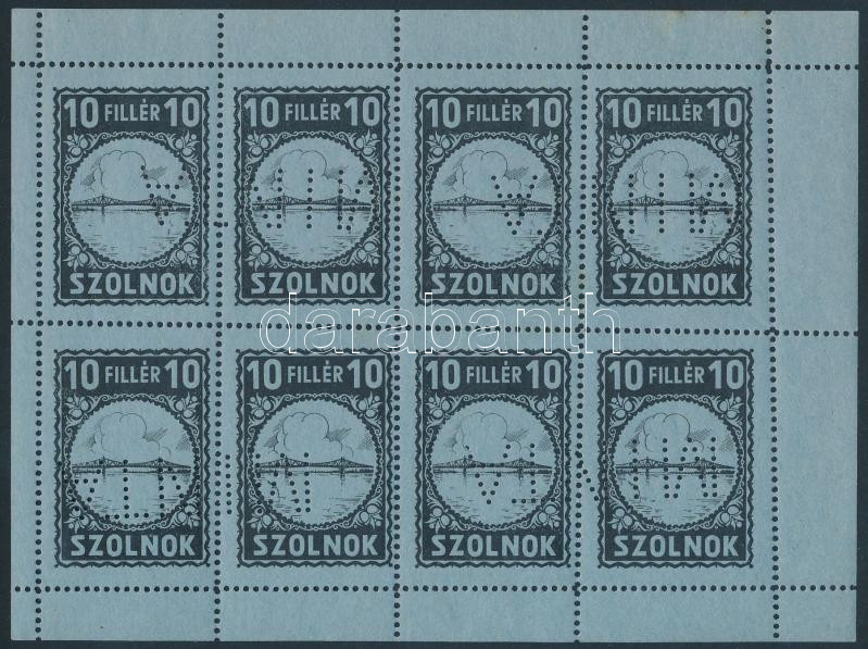 Leírás: 1930 Szolnok városi illetékbélyeg 10f nyolc értékes kisív (30.000)