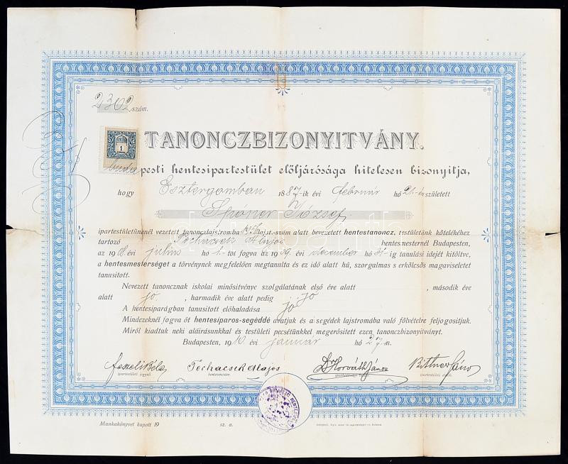 Leírás: 1910 Tanoncbizonyítvány budapesti hentesipari elöljárósága által kiadva, hajtogatva, kis szakadással a hajtásnyom mentén, 33x41cm