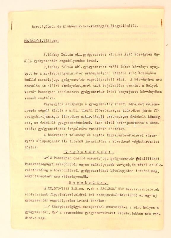 Leírás: 1938 Borsod, Gömör és Kishont k. e. e. vármegyék kisgyűlésének gépelt határozata gyógyszertár létesítésének elutasításáról