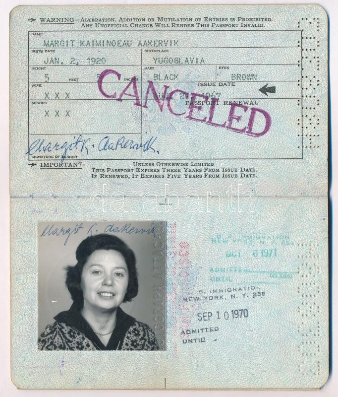 1967 Amerikai Egyesült Államok útlevele jugoszláv születésű hölgy (Nemzetes vitéz Huckaby K. Margit) részére, pp.:19, 15x10cm / US. passport for Yugoslav-born lady, (Nemzetes vitéz Huckaby K. Margit) , pp.:19, 15x10cm