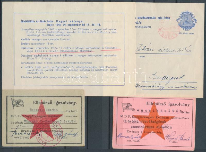Leírás: 1948 Bencsik István földművelésügyi államtitkárnak címzett kiállítási lap, MDP igazolványok