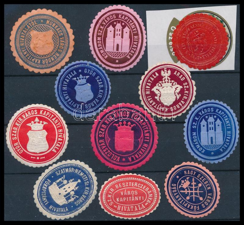 Leírás: Kapitányi hivatalok 11 klf pecsétbélyeg + Országos Erdészeti Egyesület öntapadós bélyeg