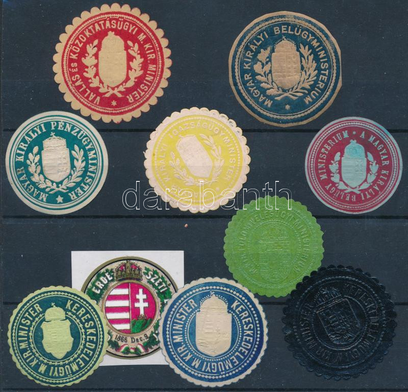 Leírás: Magyar Királyi Minisztériumok 9 klf pecsétbélyeg, közte 1 db fekete + Országos Erdészeti Egyesület öntapadós bélyeg