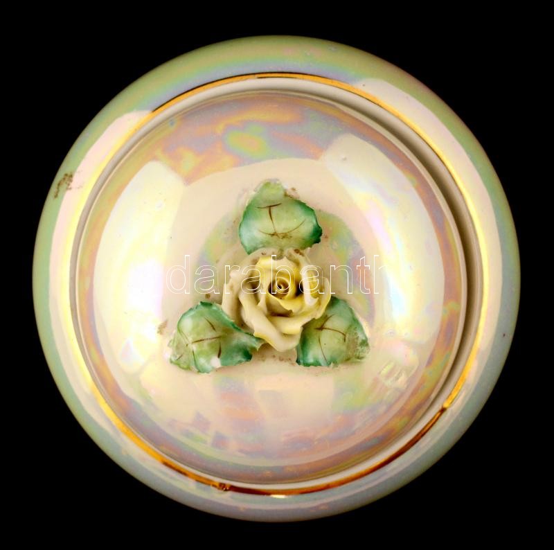 Leírás: Gyöngyházfényű rózsás bonbonier, kézzel festett, jelzett (Kispest), kis kopásnyomokkal, m: 9 cm