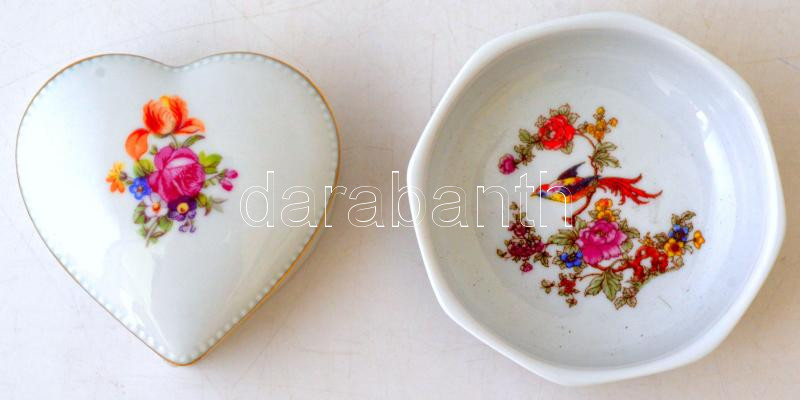 Leírás: Hollóházi és német porcelánok (mini váza, ékszertartó dobozka, tálka), 4 db, hibátlanok, jelzettek
