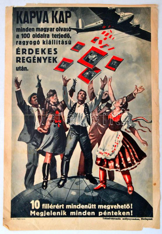 cca 1940 Érdekes Regények reklám plakát, Budapest, Tolnai-nyomda, folt... https://www.darabanth.com/hu/272-Gyorsarveres/272.0/Festmeny-mutargy-papirregiseg-egyeb/Reklam~31/cca-1940-Erdekes-Regenyek-reklam-plakat-Budapest-Tolnai-nyomda-foltos-szakadozott-44x30-cm~II1387269