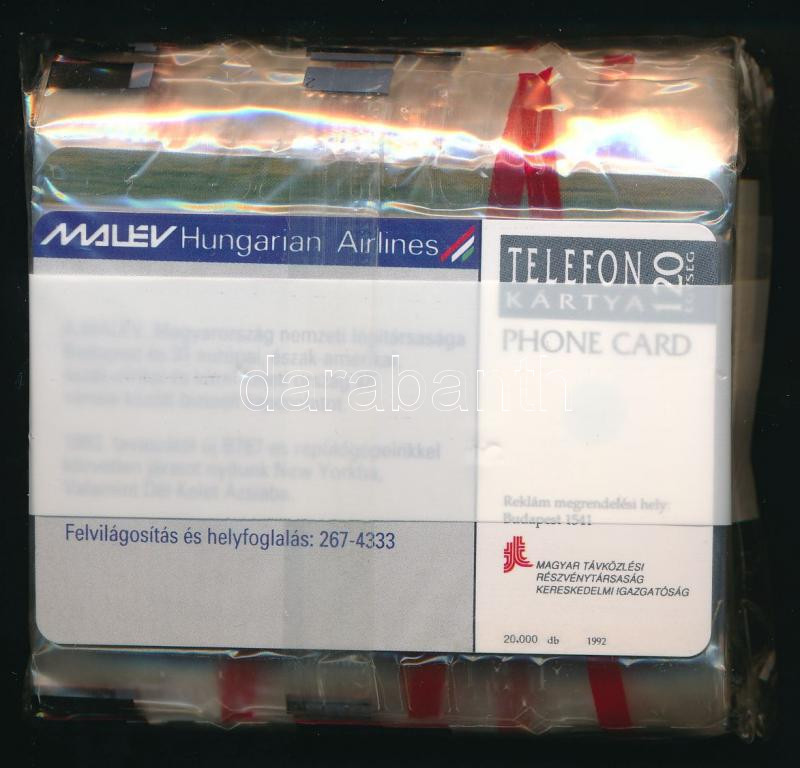 1992 Malév telefonkártyák eredeti, bontatlan csomagolásban, 25db. https://www.darabanth.com/hu/272-Gyorsarveres/272.0/Festmeny-mutargy-papirregiseg-egyeb/Telefonkartyak~34/1992-Malev-telefonkartyak-eredeti-bontatlan-csomagolasban-25db~II1386053