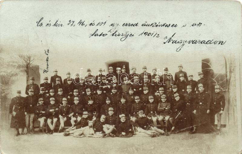 1901/2 Nagyvárad, Cs. és kir. 37., 46. és 101. gyalogezred önkéntesei ... https://www.darabanth.com/hu/272-Gyorsarveres/272.0/Kepeslapok/Erdely~400314/19012-Nagyvarad-Cs-es-kir-37-46-es-101-gyalogezred-onkentesei-es-oktatotisztjei-mil~II1388236