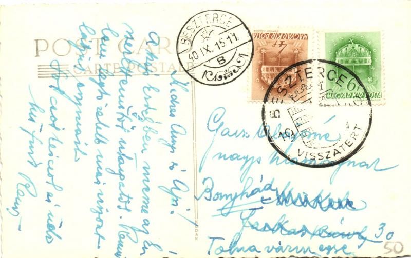 1940 Beszterce, Bistritz, Bistrita; Híd / bridge, 'Beszterce viss... https://www.darabanth.com/hu/272-Gyorsarveres/272.0/Kepeslapok/Erdely~400314/1940-Beszterce-Bistritz-Bistrita-Hid-bridge-Beszterce-visszatert-So-Stpl-photo-kis-sz~II1387931