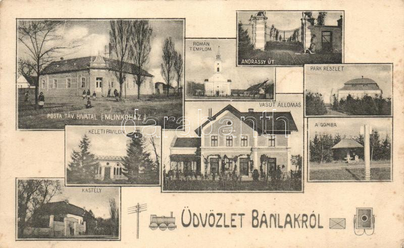 Leírás: Bánlak, Banloc; Posta, Vasútállomás, kastély, templom / post office, railway station, castle, church (fa)