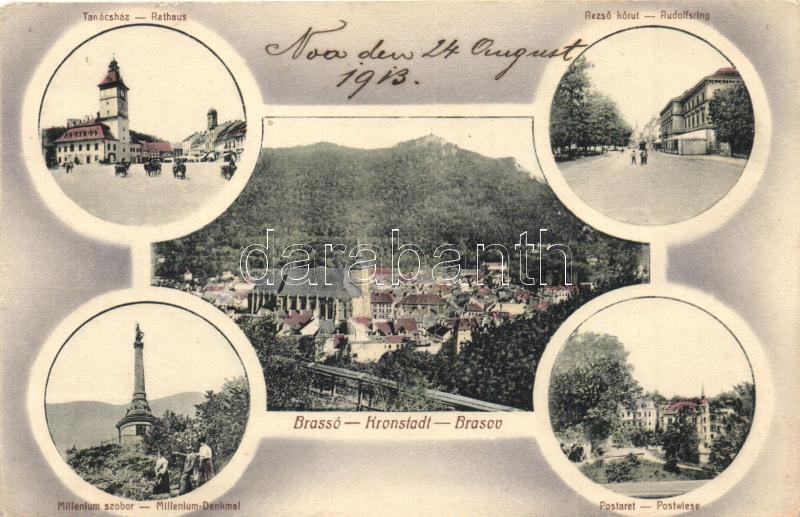 Leírás: Brassó, Kronstadt, Brasov; Látkép, tanácsháza, Millenium szobor, Rezső körút, Posta rét, kiadja A. Seuler / general view, town hall, statue, avenue, meadow