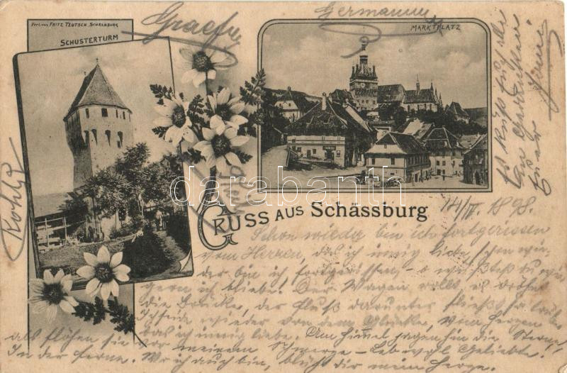 Leírás: Segesvár, Schässburg, Sighisoara; piactér, Schusterturm, torony, kiadja Fritz Teutsch / market place, tower, floral (Rb)