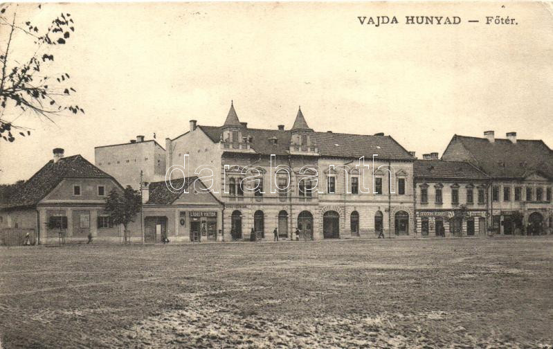 Leírás: Vajdahunyad, Hunedoara; Fő tér, Licker Viktor, Tóth Ede üzletei, gyógyszertár / main square, shops, pharmacy (EK)