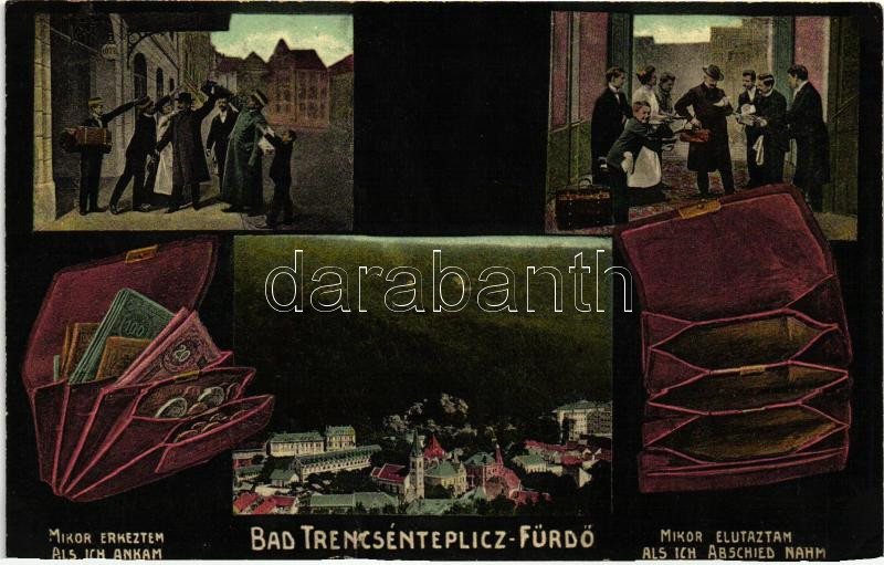 Leírás: Trencsénteplic-fürdő, Trencianske Teplice; Látkép, 'Mikor érkeztem- Mikor elutaztam' humoros képeslap, kiadja Wertheim Zsigmod / general view, humorous (b)