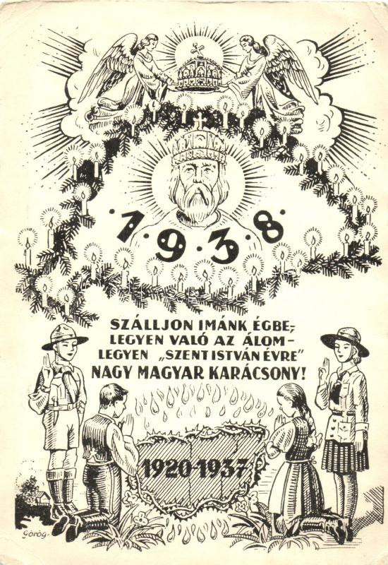 Leírás: 1938 Szent István év, cserkészek, irredenta propagandalap / Hungarian patriotic propaganda, scouts, irredenta s: Görög (EB)