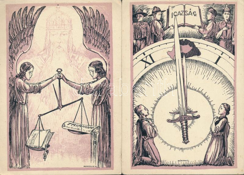 Leírás: 2 db irredenta, cserkész grafikai képeslap / 2 Hungarian graphic irredenta and scout postcard s: Márton L.