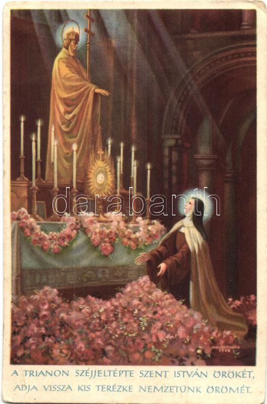Leírás: A Trianon széjjeltépte Szent István örökét, adja vissza Kis Terézke nemzetünk örömét. / Hungarian irredenta s: Hollós Endre (EK)