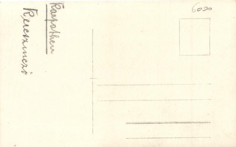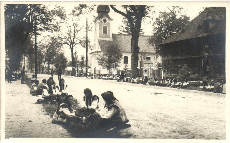 Leírás: Kőrösmező, Yasinia; utca, katolikus templom, népviseletbe öltözött asszonyok katonákkal / street, church, folklore women with soldiers, photo