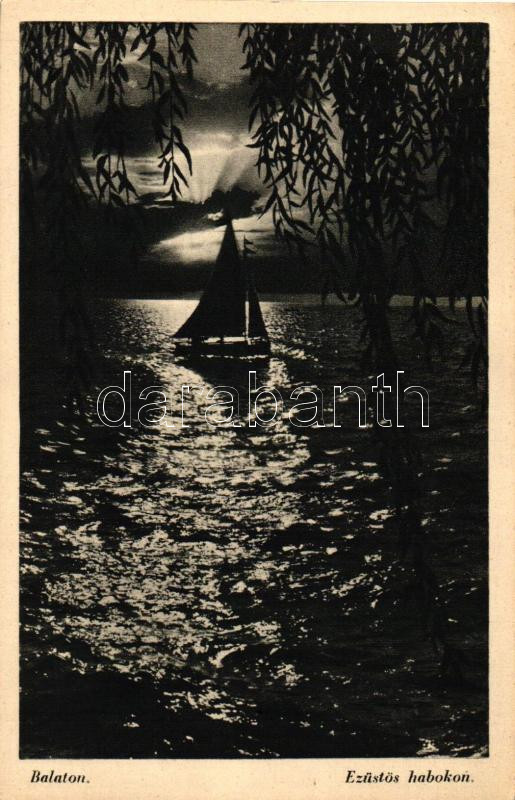 Balaton, Ezüstös habokon, vitorlás hajó https://www.darabanth.com/hu/272-Gyorsarveres/272.0/Kepeslapok/Magyarorszag~200075/Balaton-Ezustos-habokon-vitorlas-hajo~II1332004