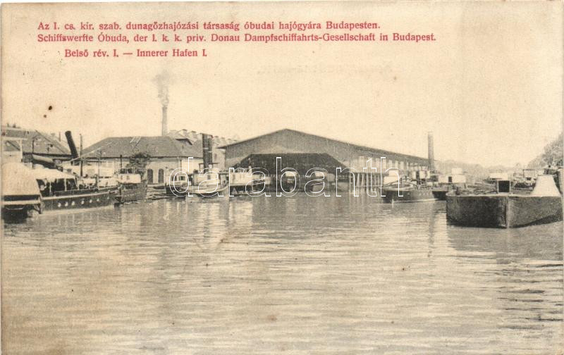 Leírás: Budapest III. Óbuda, Az I. császári királyi szabad dunagőzhajózási társaság hajógyára, belső rév, gőzhajó