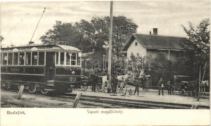 Leírás: Budapest XXII. Budafok, vasúti megállóhely, villamos, kiadja Kohn és Grünhut