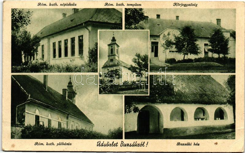 Leírás: Buzsák, Körjegyzőség, római katolikus népiskola, plébánia, templom, buzsáki ház (fa)