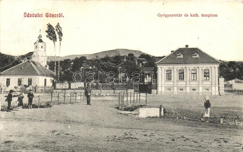 Leírás: Gönc, Gyógyszertár, Katolikus templom, kiadó Wohl Ármin