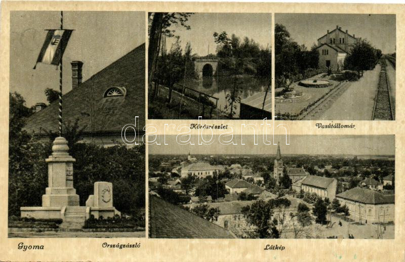 Gyoma, Vasútállomás, látkép, országzászló, Kőrös részlet https://www.darabanth.com/hu/272-Gyorsarveres/272.0/Kepeslapok/Magyarorszag~200075/Gyoma-Vasutallomas-latkep-orszagzaszlo-Koros-reszlet~II1382201