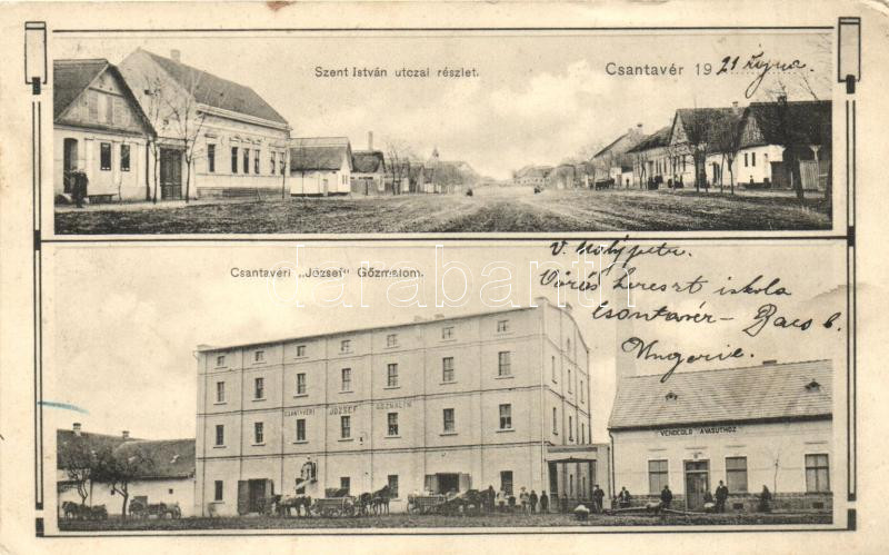 Leírás: Csantavér, Cantavir; József gőzmalom, vendéglő a vasúthoz, Szent István utca, kiadja Krausz Mór / steam mill, restaurant, street (EK)