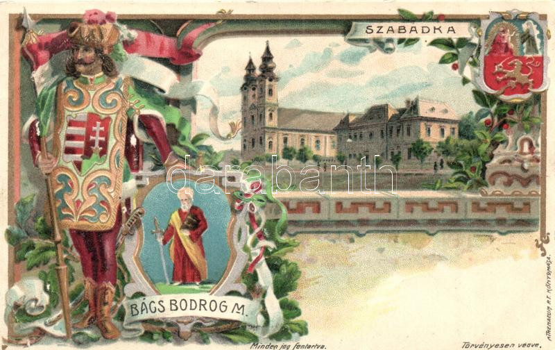 Leírás: Szabadka, Subotica; templom, Bács-Bodrog megye címere; Athenaeum Rt. kőnyomdája / church, coat of arms, floral, litho (EK)