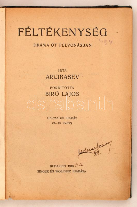 Leírás: Arcibasev: Féltékenység. Dráma öt felvonásban. Fordította Biró Lajos. Bp., 1918, Singer és Wolfner. A címlap javított. Korabeli félvászonkötésben.