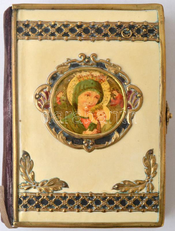 Kapcsos, rézveretes félbársony könyv, a kötéstáblákon fehér bakelittal, az elülső kötéstáblán Mária a kisded képrészlettel, festettel lapélekkel. Néhol ceruzás bejegyzéssel.