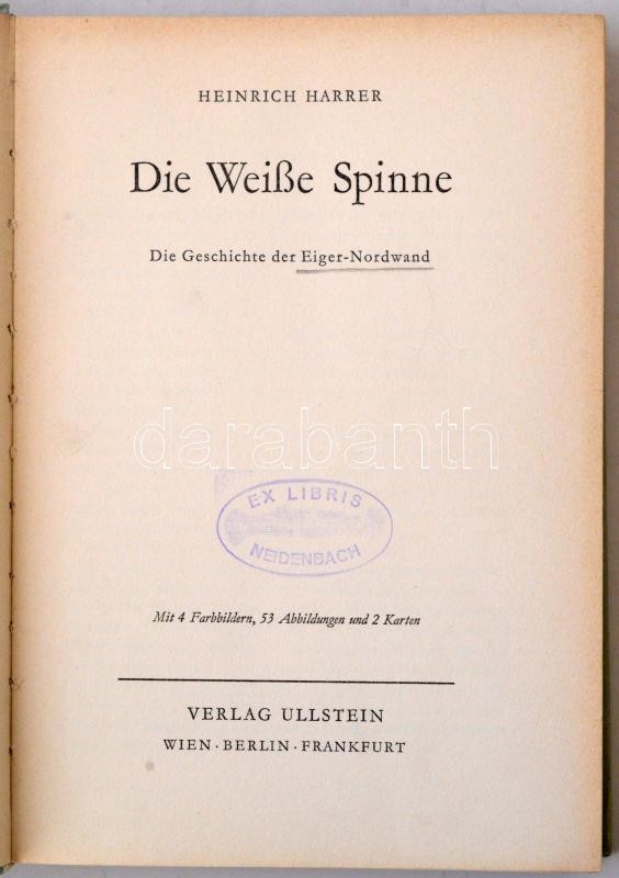 Heinrich Harrer: Die Weiße Spinne. Die Geschichte der Eiger-Nordwand. Wien-Berlin-Frankfurt, 1959,Ullstein, 228 p. Kiadói egészvászon kötés. Számos képpel illusztrálva. Ex libris-szel. Heinrich Harrer A fehér pók c. könyve, német nyelven. A borító maszatos. A 200-201. p. között a képek kijárnak. / Heinrich Harrer: The White Spider, in german language, linen-binding, the cover is spotty, some pictures are coming out from it.