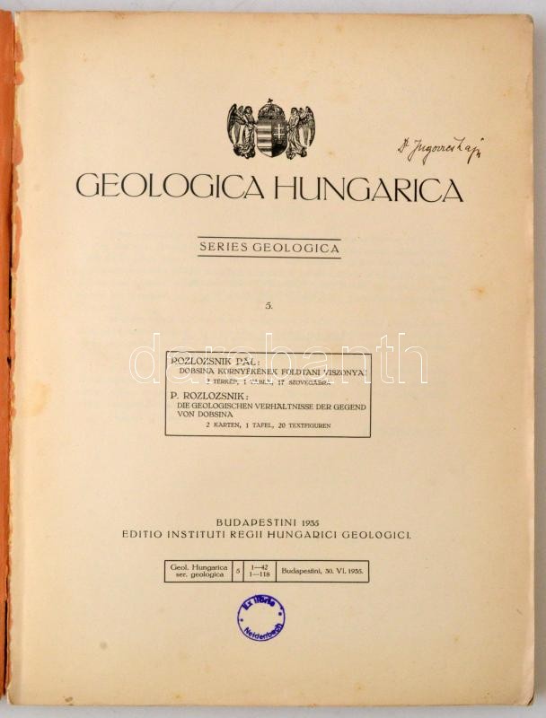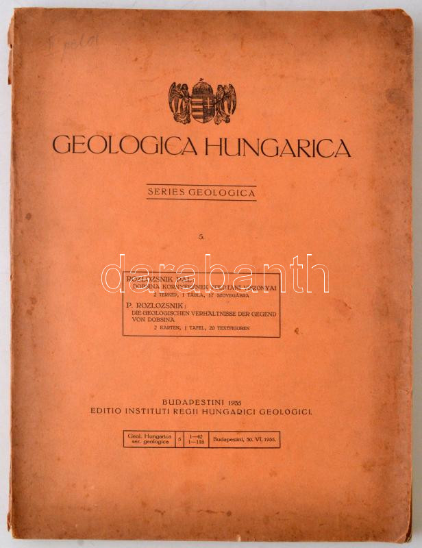 Rozlozsnik Pál: Dobsina Környékének Földtani Viszonyai. Geologica Hungarica. Series Geologica 5. Budapest, 1935, Magyar Királyi Földtani Intézet, 118 p.+2 t. Kiadói papírkötés, magyar és német nyelven. Számos szövegközti és egészoldalas illusztrációval. A címlapon ex libris bélyegzővel. A borítója foltos, szakadt, viseltes. / Rozlozsnik Pál: The geological features of region of Dobsina, in hungarian, and german language, paperbinding,with a lot of illustrations, the cover is in poor condition.