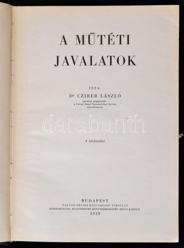 Dr. Czirer László: A műtéti javalatok. 4 táblázattal. A Magyar Orvosi Könyvkiadó Társulat Könyvtára CLXV. Kötet. Budapest, 1939, Magyar Orvosi Könyvkiadó Társulat. Kopottas kiadói egészvászon kötés, 260 p. A 6. p. tulajdonosi névbejegyzéssel.