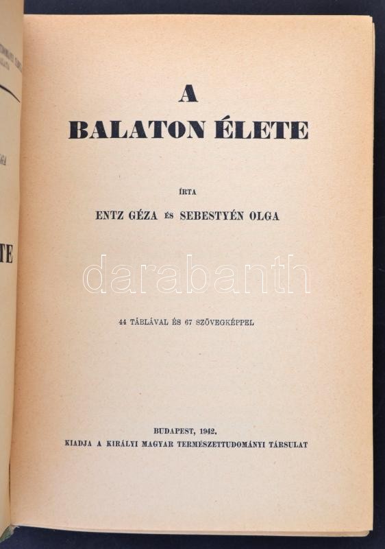 Entz Géza, Sebestyén Olga: A Balaton élete. Bp., 1942 Királyi Magyar Természettudományi Társulat. 44 táblával és 67 szövegképpel. Kiadói félvászonkötésben, a vászon két helyen enyhén foltos.