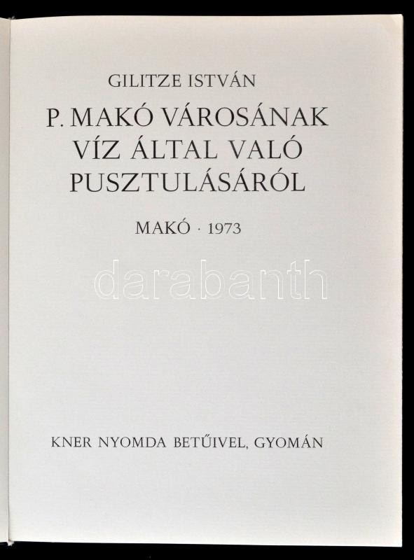 Gilitze István: P. Makó városának víz által való pusztulásáról. Makó, 1973, Csongrád megyei - Makói Városi Tanács. Kiadói papírkötés, 39 p.1821-es reprintje. A könyvben Jámboriné Balog Tünde 4 db. fekete-fehér illusztrációjával.